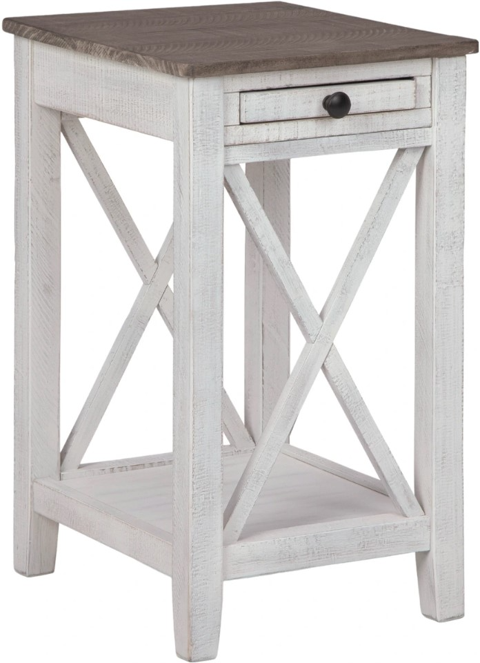 Modern meets vintage in this accent table. Made of wood, it creates a vintage vibe with a distressed white and gray finish and crossbuck supports on two sides. Two USB charging ports add modern function. This is a must-have piece for your living space.Read More