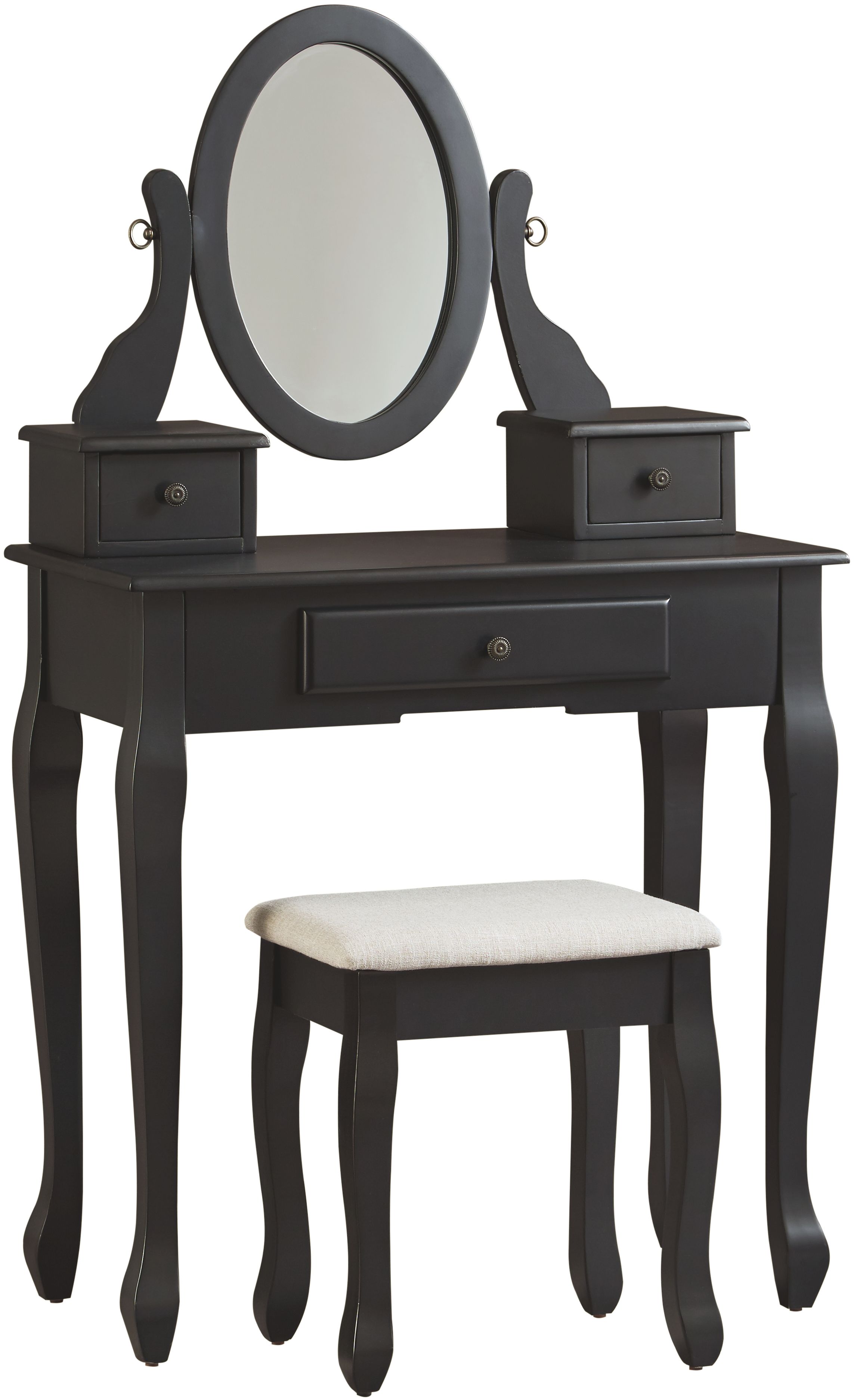 3-piece vanity set includes upholstered stool, vanity, and swivel mirror