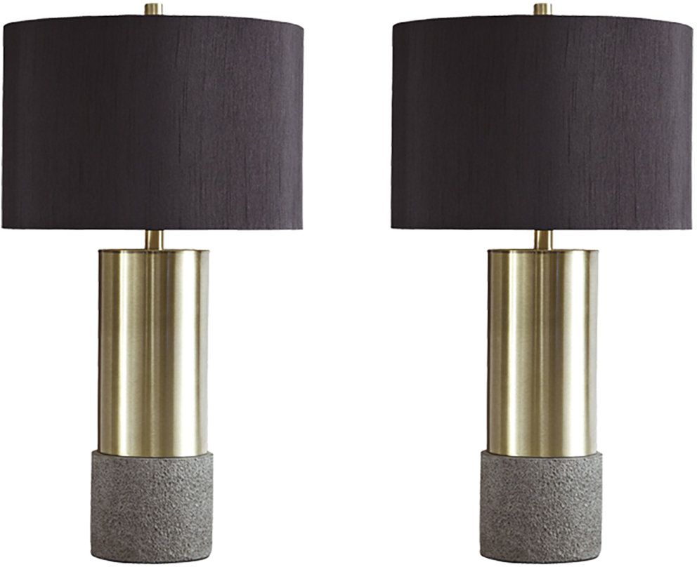 Faux concrete sets the stage for this ultra-contemporary brass-tone table lamp. This substantial lamp is topped with a chic all-black shade and a gold-tone foil interior for an elegant aesthetic.Read More
