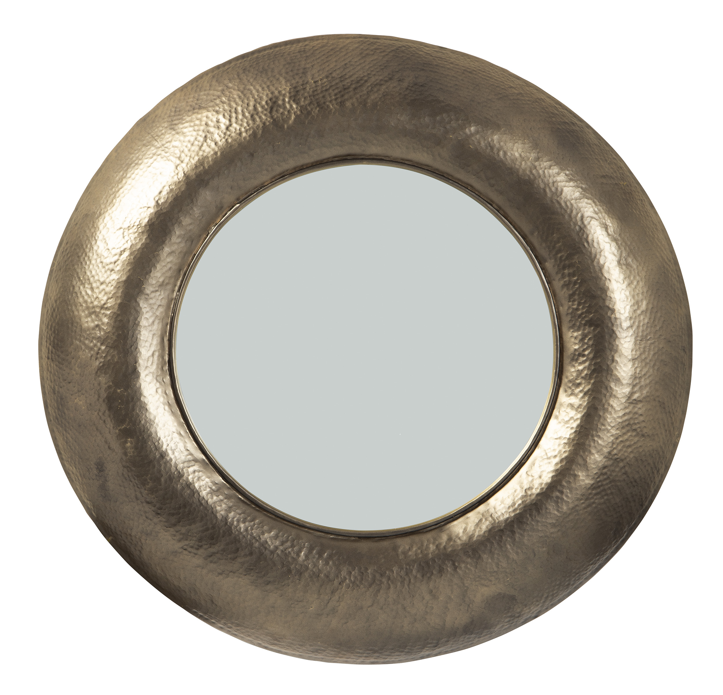 Brighten any space in modern style with this wall mirror. Surrounded by a thick convex round frame crafted of sturdy metal with hammered texture and brilliant antiqued goldtone finish makes this wall mirror a trendy, contemporary must-have for your home.