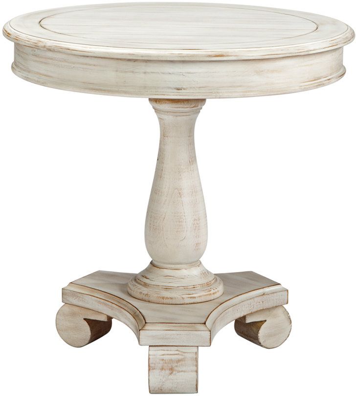 The Mirimyn white accent table features a scrolled pedestal base, a weathered white finish, and a round tabletop for a charming place to put décor, lamps, or your favorite chair-side drink.