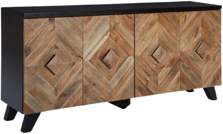 Diamond life. Make a bold, brilliant statement with this 4-door accent cabinet. Its two-tone styling merges a dark brown exterior with a multi-tonal distressed finish on the doors and handles. A diamond-shaped plank effect brings rich, dimensional flair to the scene. Adjustable shelving makes this high-end accent piece highly functional.Read More